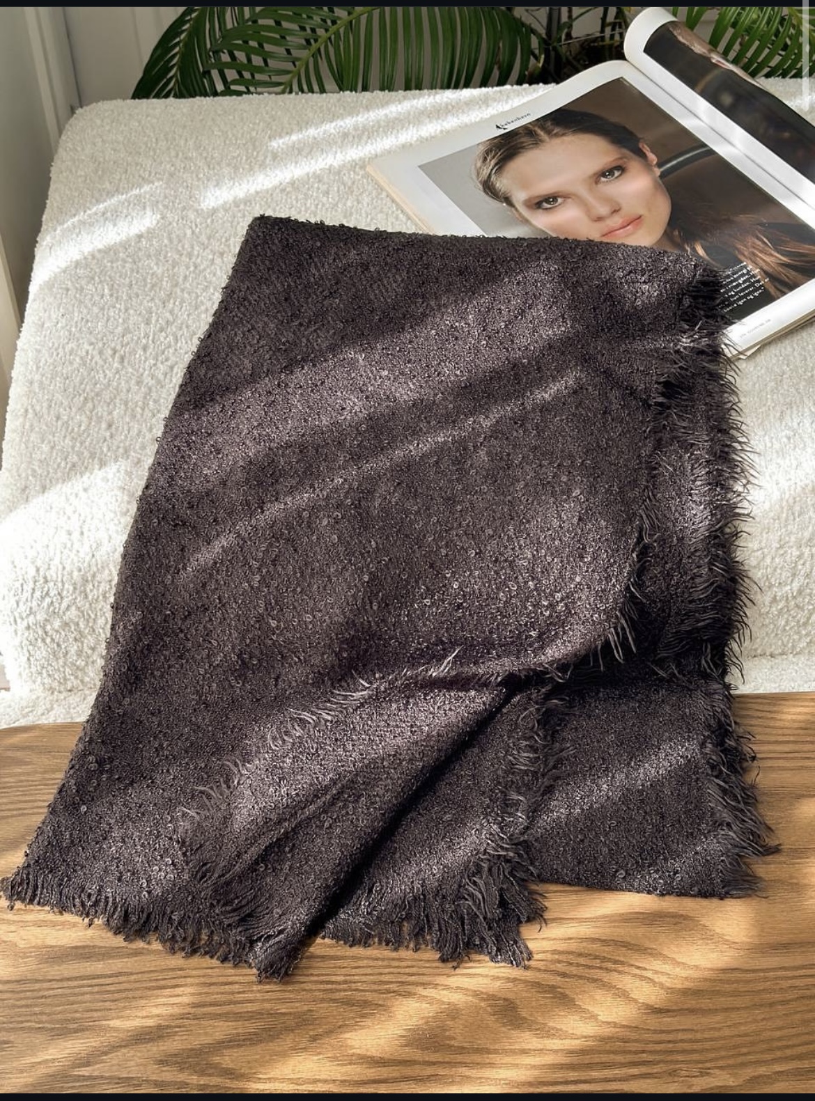 این شال در سه رنگ جذاب قهوهای، مشکی و سرمهای عرضه شده تا بهراحتی با انواع مانتو و پالتو ست شود.